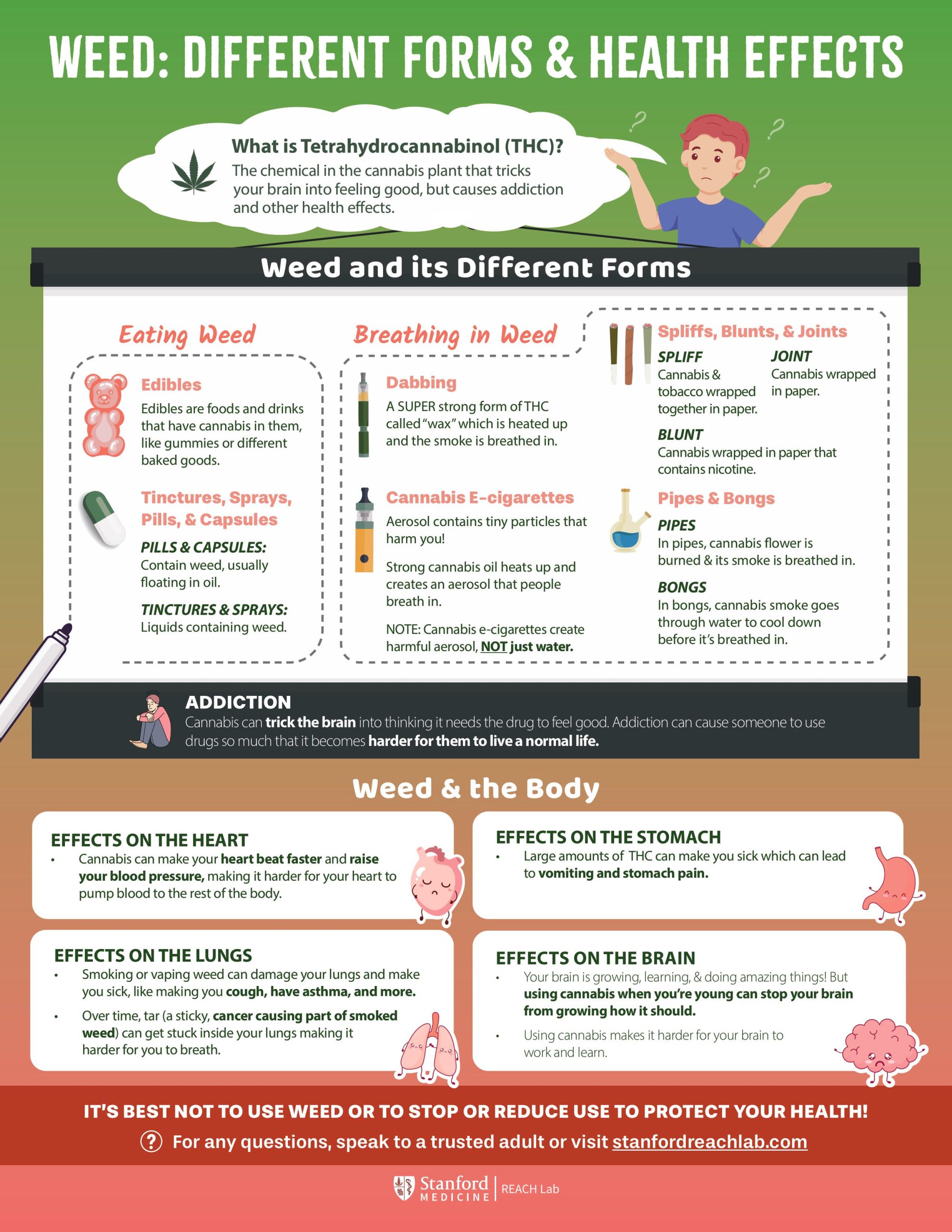 Cannabis has many names: “pot”, “marijuana”, “weed”. Cannabis has two main parts CBD and THC. THC is a mind-altering chemical that affects a person's mood, thoughts, and perceptions. Cannabis can be smoked, vaped, or eaten in a food or drink.