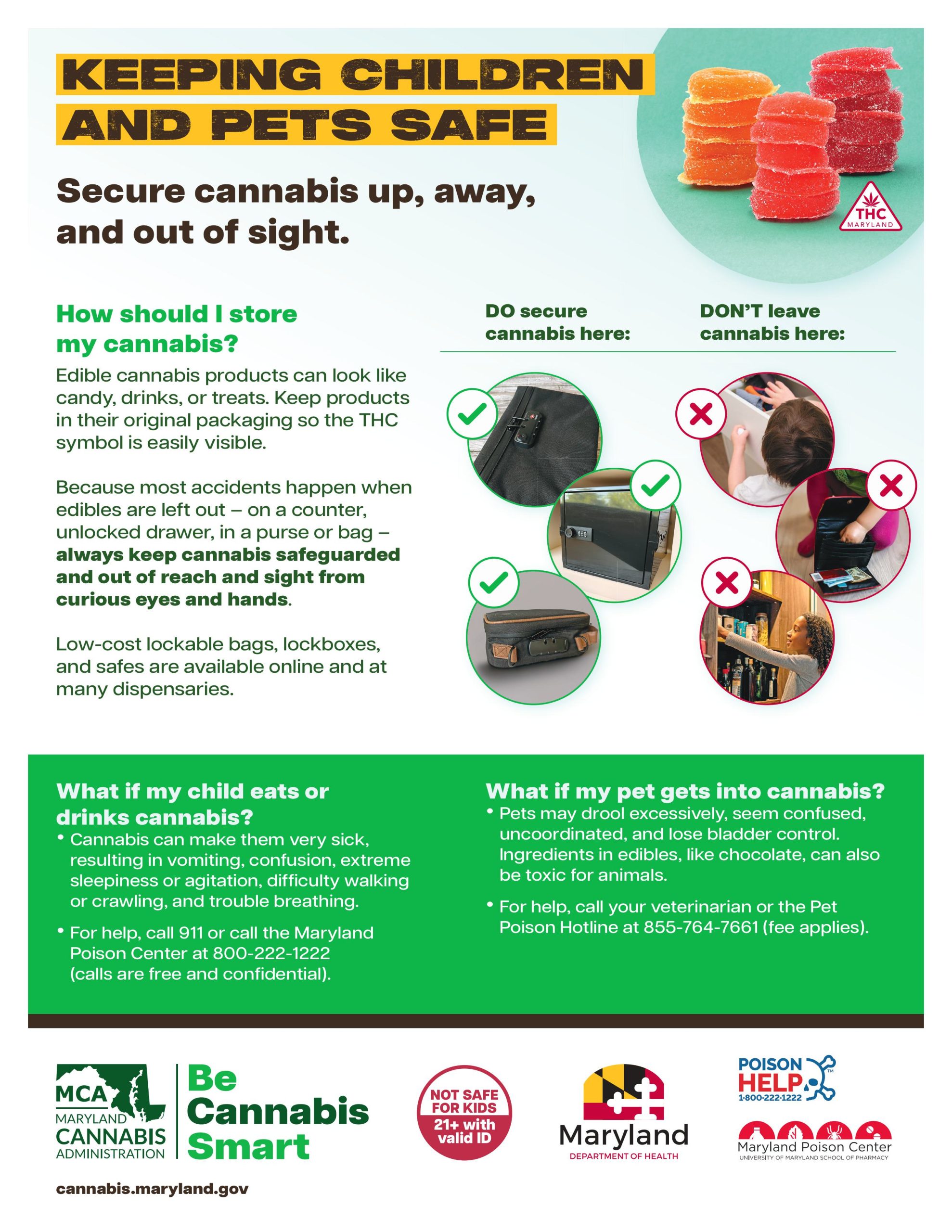 Call Maryland Poison Control if a child or pet gets into cannabis: +1 800-222-1222