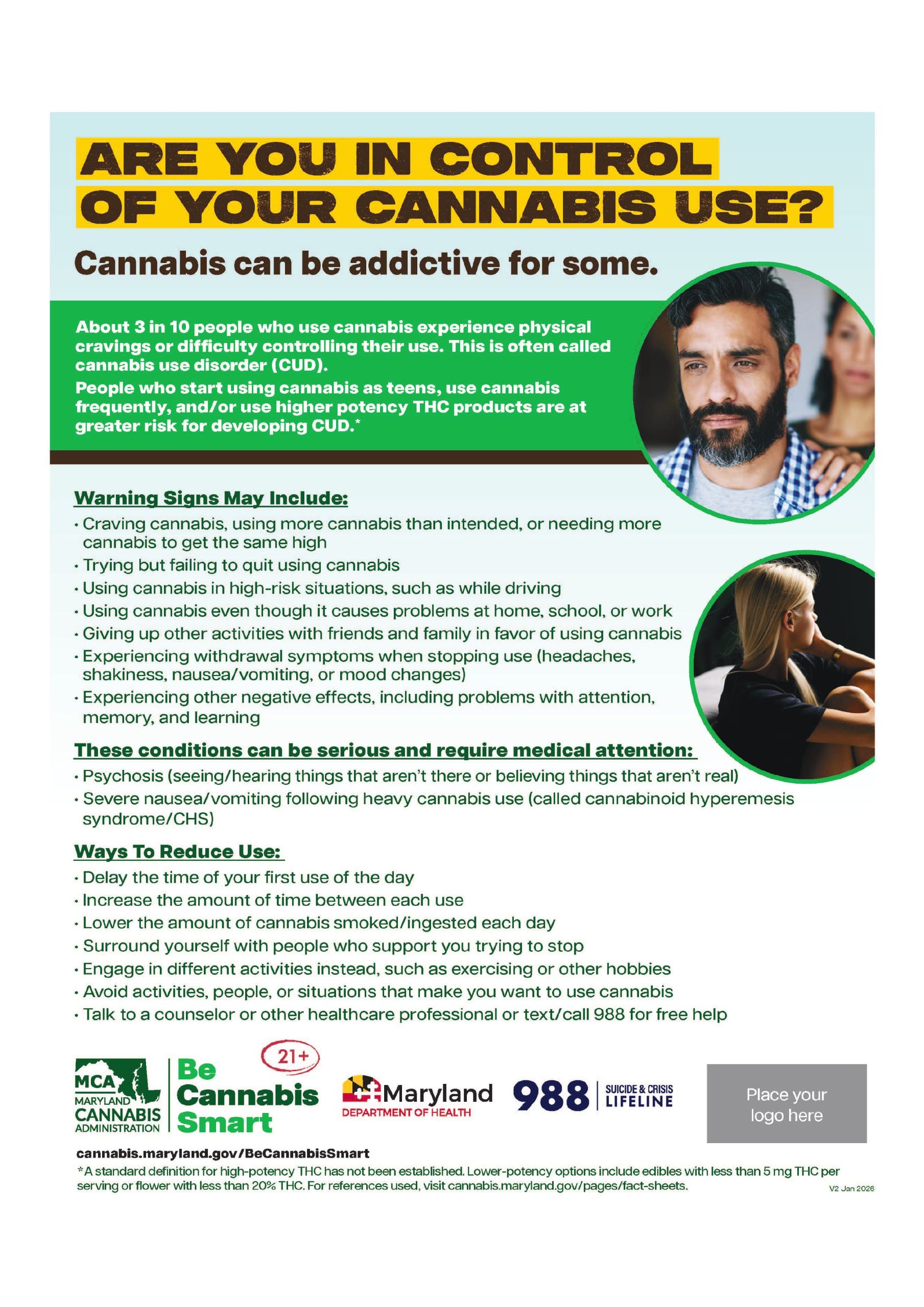 In Maryland cannabis is legal for medical and recreational purposes for those over the age of 21 years or older. Legalization has created a perception that cannabis is legal and therefore safe however that is not the case especially when it comes to people under the age of 21.